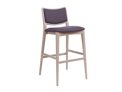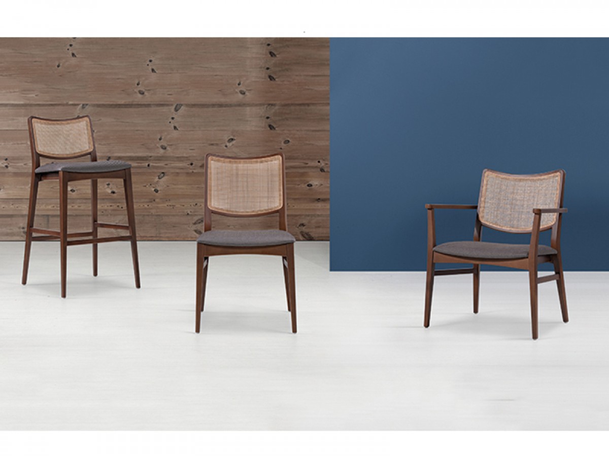 • The Spirit collection includes chair, armchair, barstool and lounge, with solid beech wood frame, upholstered seat in fabric or faux leather and wicker back.