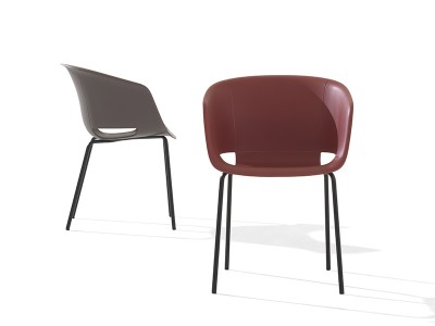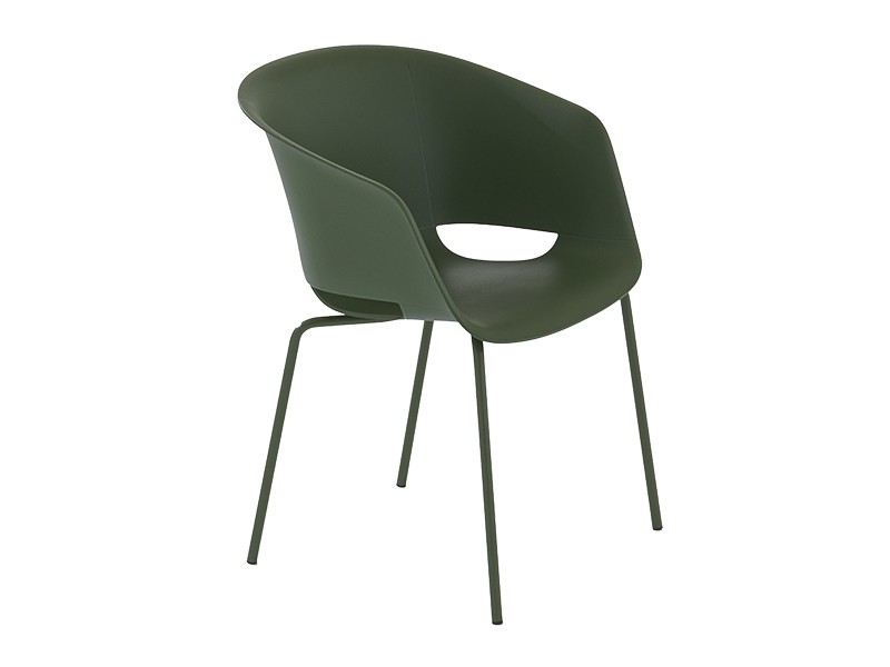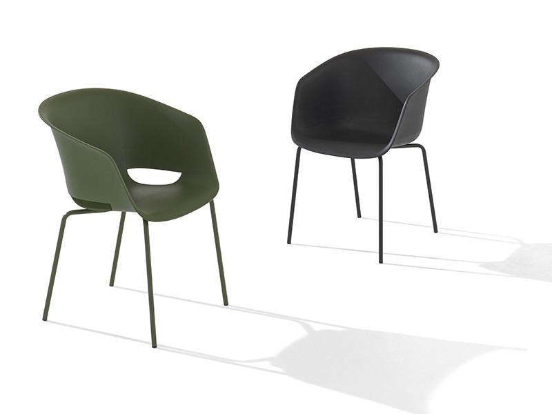 • This chair features armrests and an open-shell design supported by a steel frame with four legs.