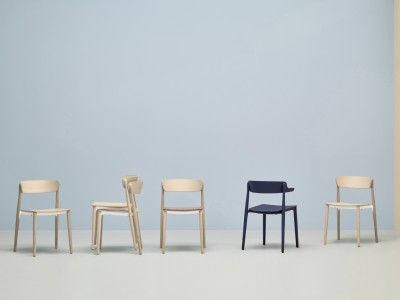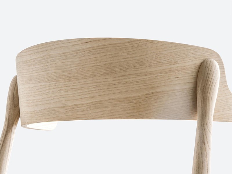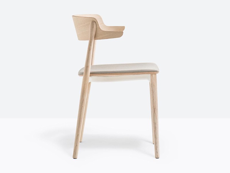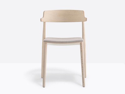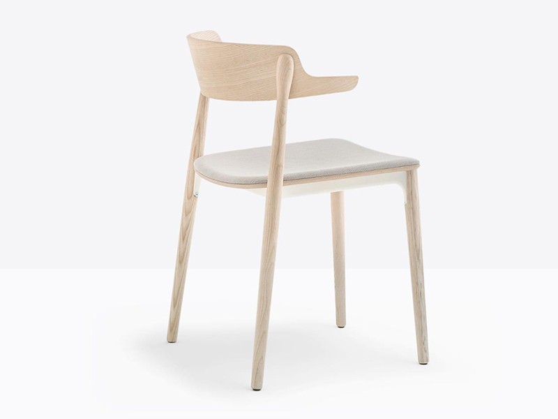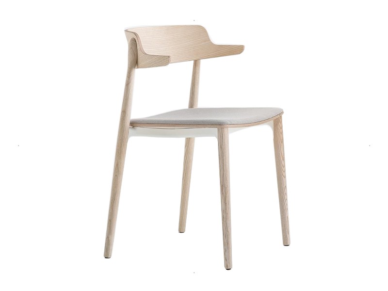 - Ash veneered plywood armchair with upholstered seat and shaped backrest, that allows to hang it on the table.