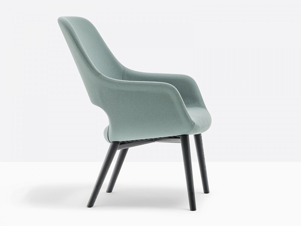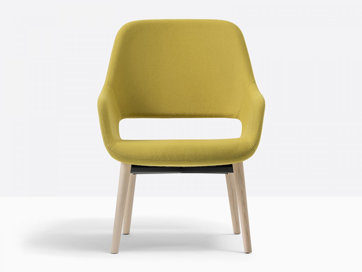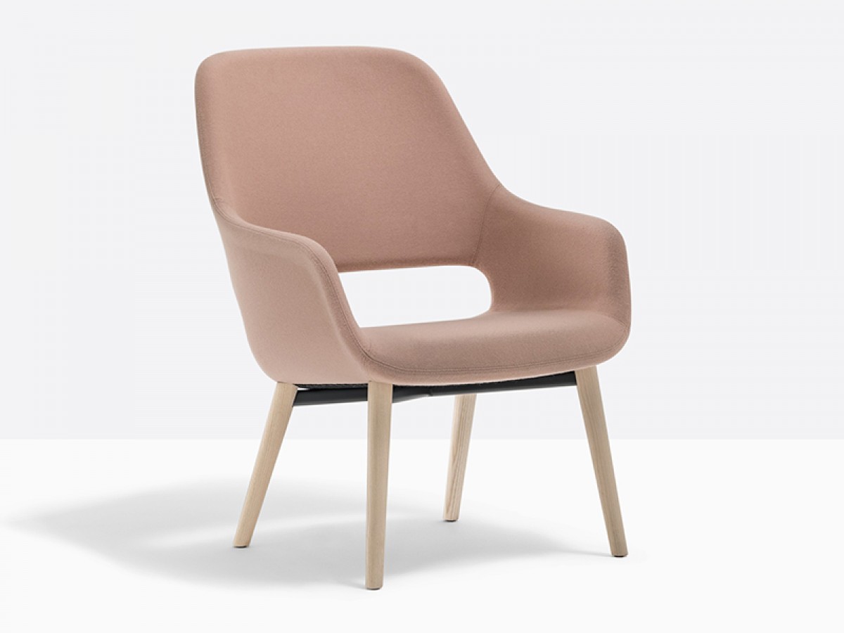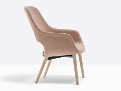 • Lounge armchair with large upholstered shell in polyurethane foam with elastic belts and solid ash wood legs.