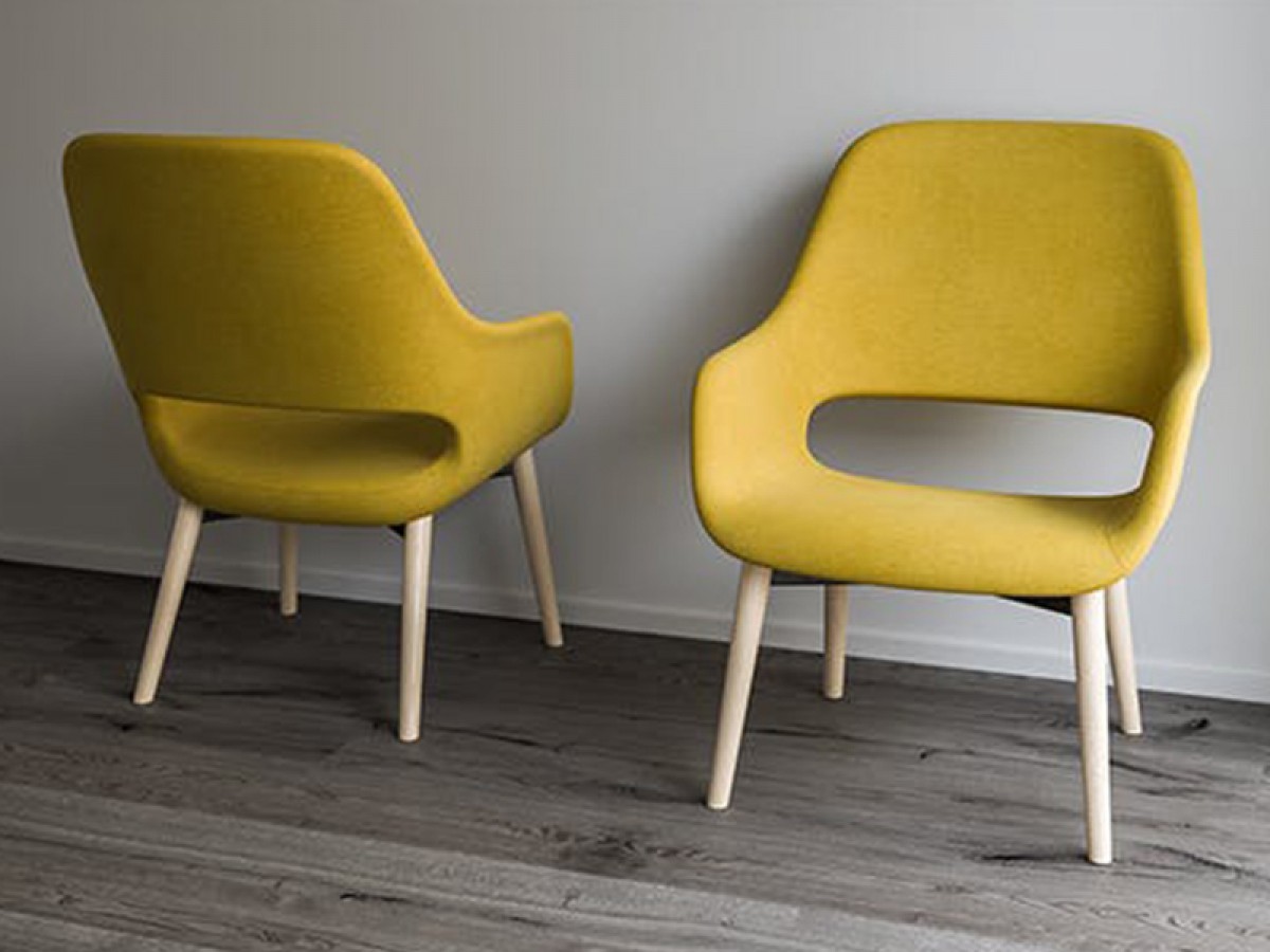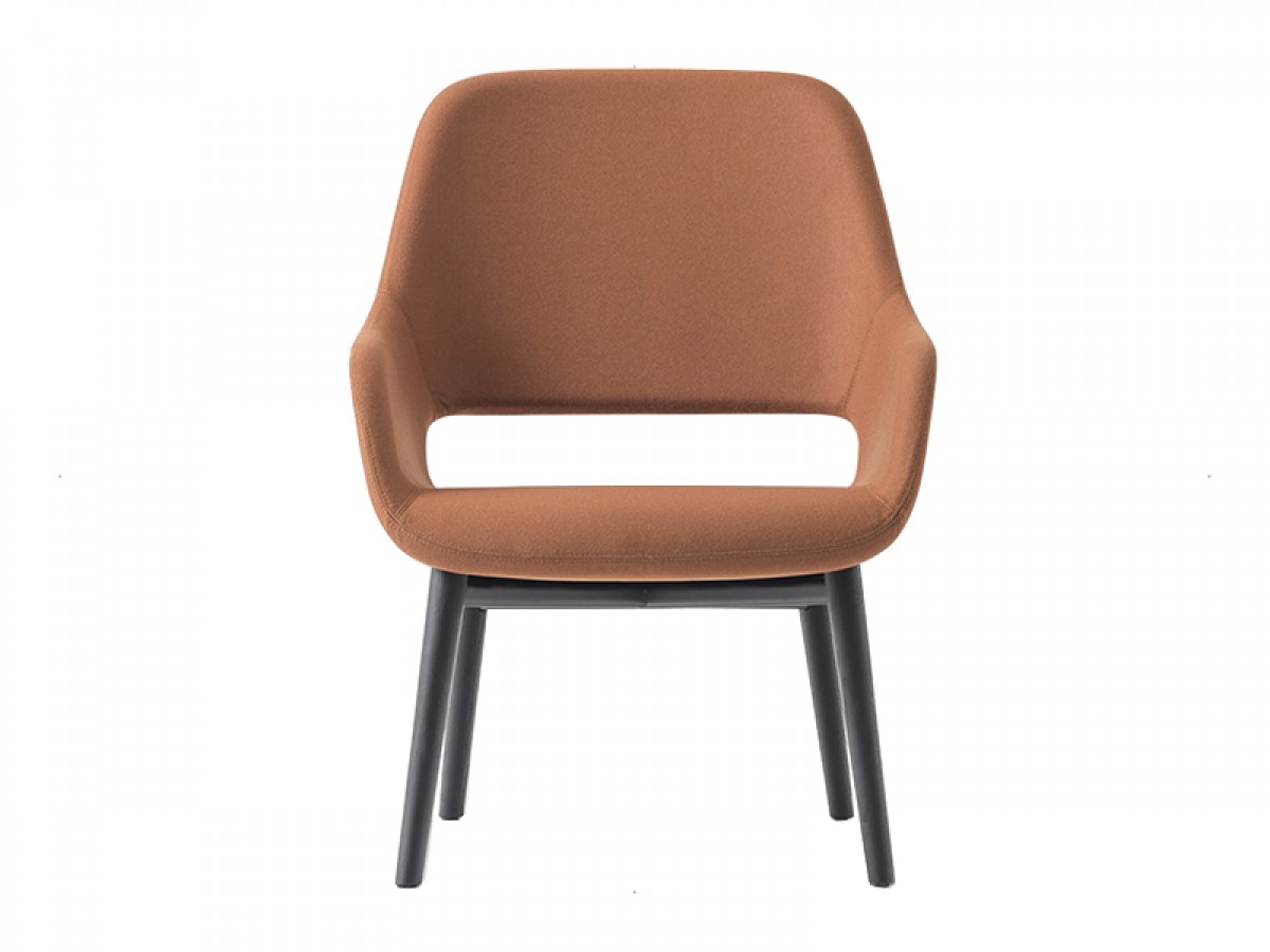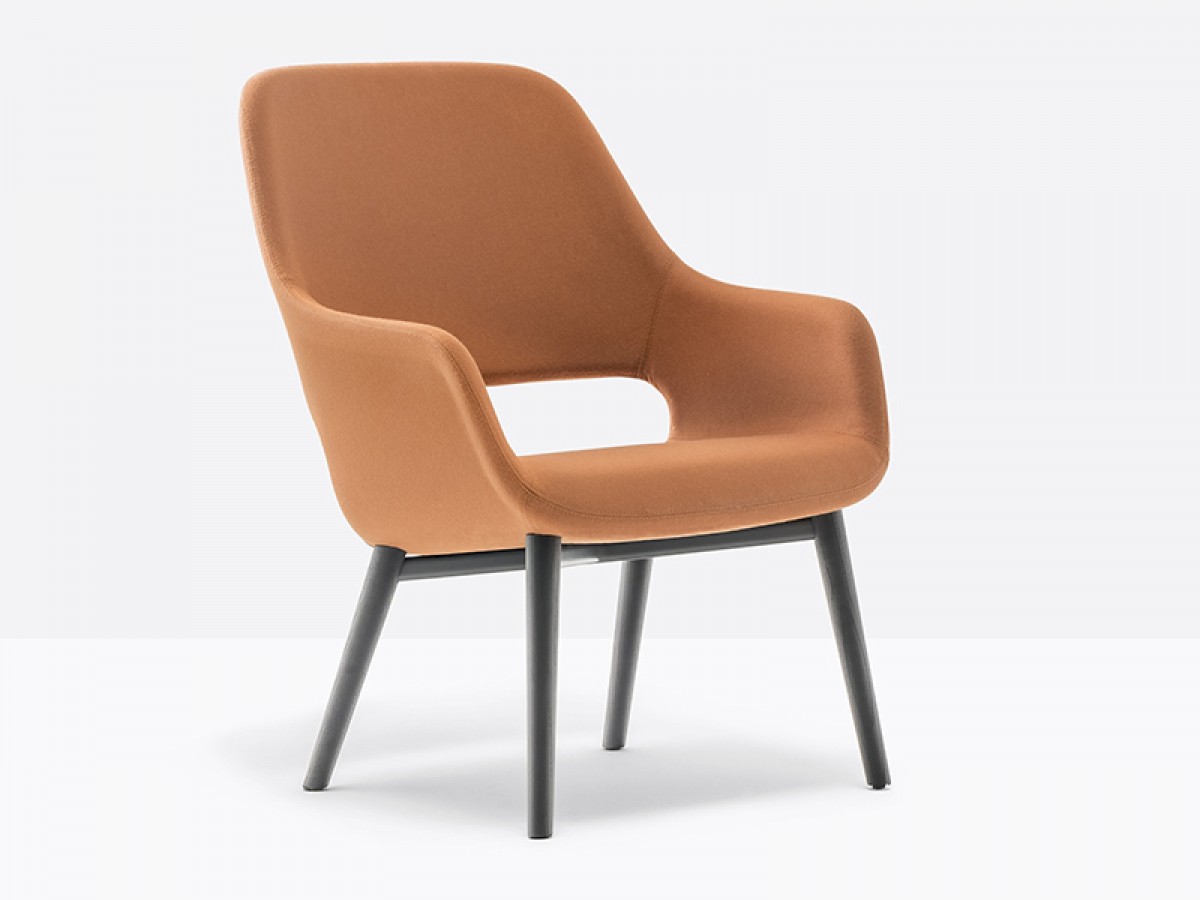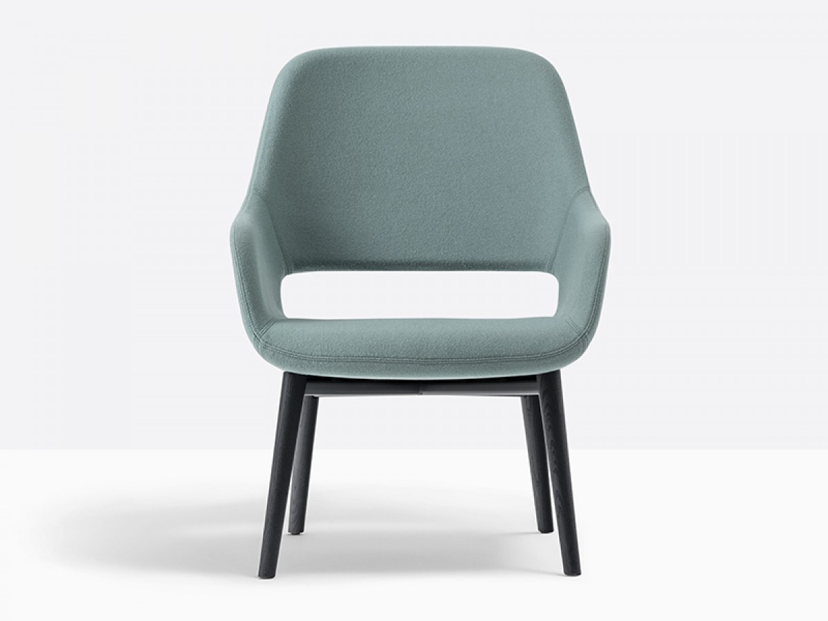 • Lounge armchair with large upholstered shell in polyurethane foam with elastic belts and solid ash wood legs.