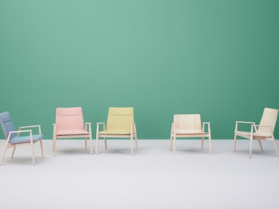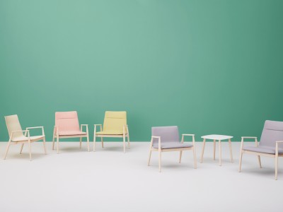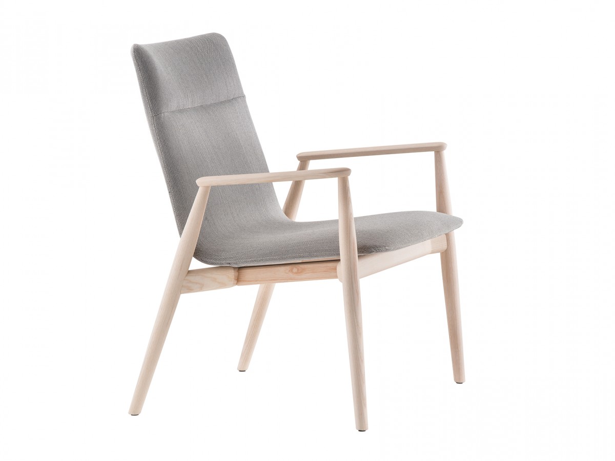 - Lounge armchair with high backrest, upholstered shell, solid ash wood frame and armrests.