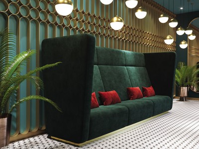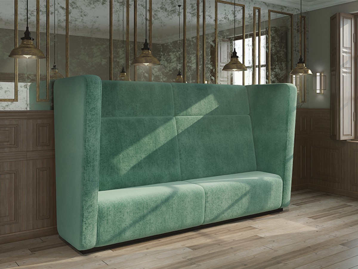 - Modular high back dining bench with high armrests.