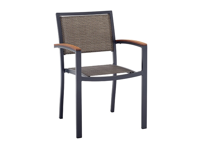 - Introducing our classic design stackable outdoor chair George M with armrests, featuring an aluminum frame elegantly covered with textylene and technowood.