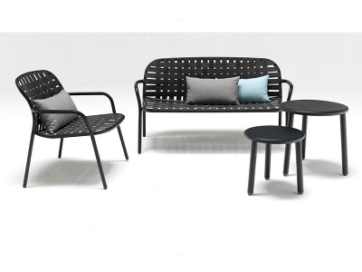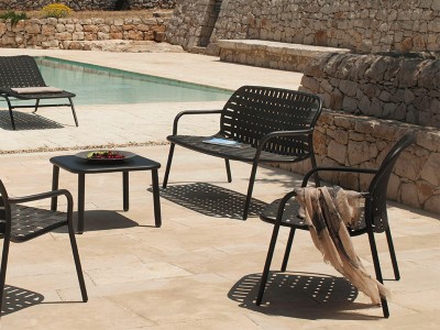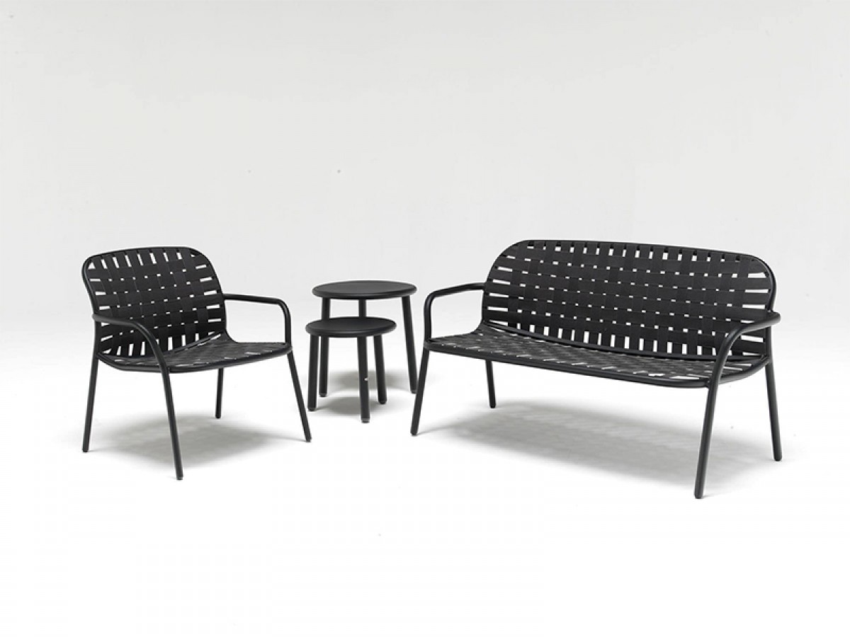 - The woven elastic straps, joined in an innovative way to the sophisticated aluminium frame, give life to a collection defined by outstanding, eclectic style and superb comfort, perfectly suitable for outdoor uses.