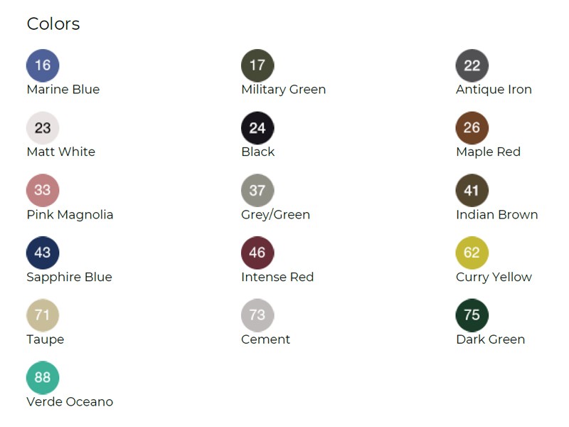 - Colours: antique iron, matt white, black, grey/green, indian brown, dark blue, mint green, scarlet red, green, blue, orange, taupe, cement, corten, copper