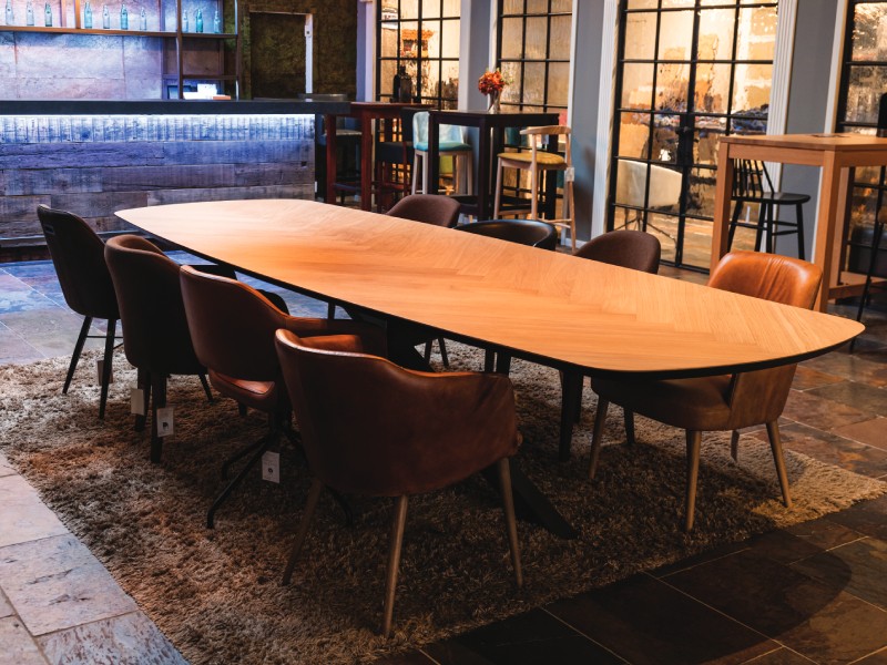 - The Grand Table harmonizes a steel lacquered base with a captivating tabletop featuring a distinctive fishbone structure.